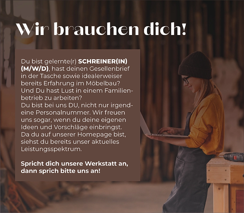 Egal, ob einzelnes Möbelstück oder Kompletteinrichtung – mit Kreativität, Sorgfalt und Erfahrung setzen wir Einrichtungswünsche von der Idee bis hin zur termingerechten Montage um.